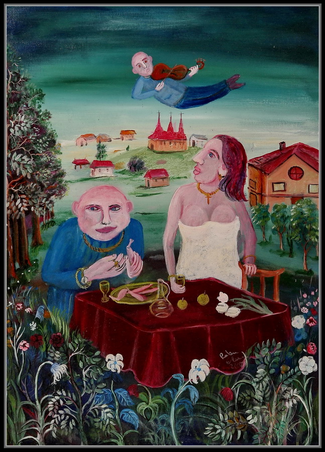 Calistrat Robu, deşi a aflat de existenţa lui Mark Chagall nu se lasă influenţat şi continuă să plutească într-o copilărie dezinvoltă cu personajele sale anecdotice.